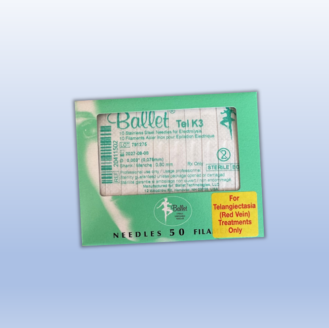 Ballet K3-Tel needles are specifically designed for the treatment of thread veins/spider veins, milia and vascular blemishes anywhere on the body. Medical grade, individually packed and sterilised. Fully compatible with both ThermaVein and Veinwave devices.